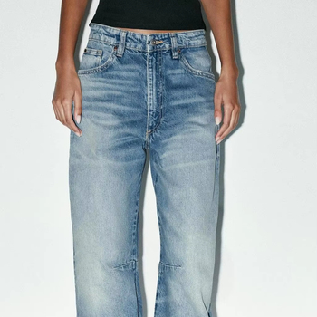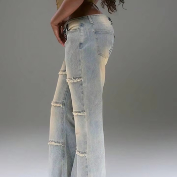 2025女式高腰蓝色牛仔裤新款时尚弹力宽腿透气特色拉链装饰批发